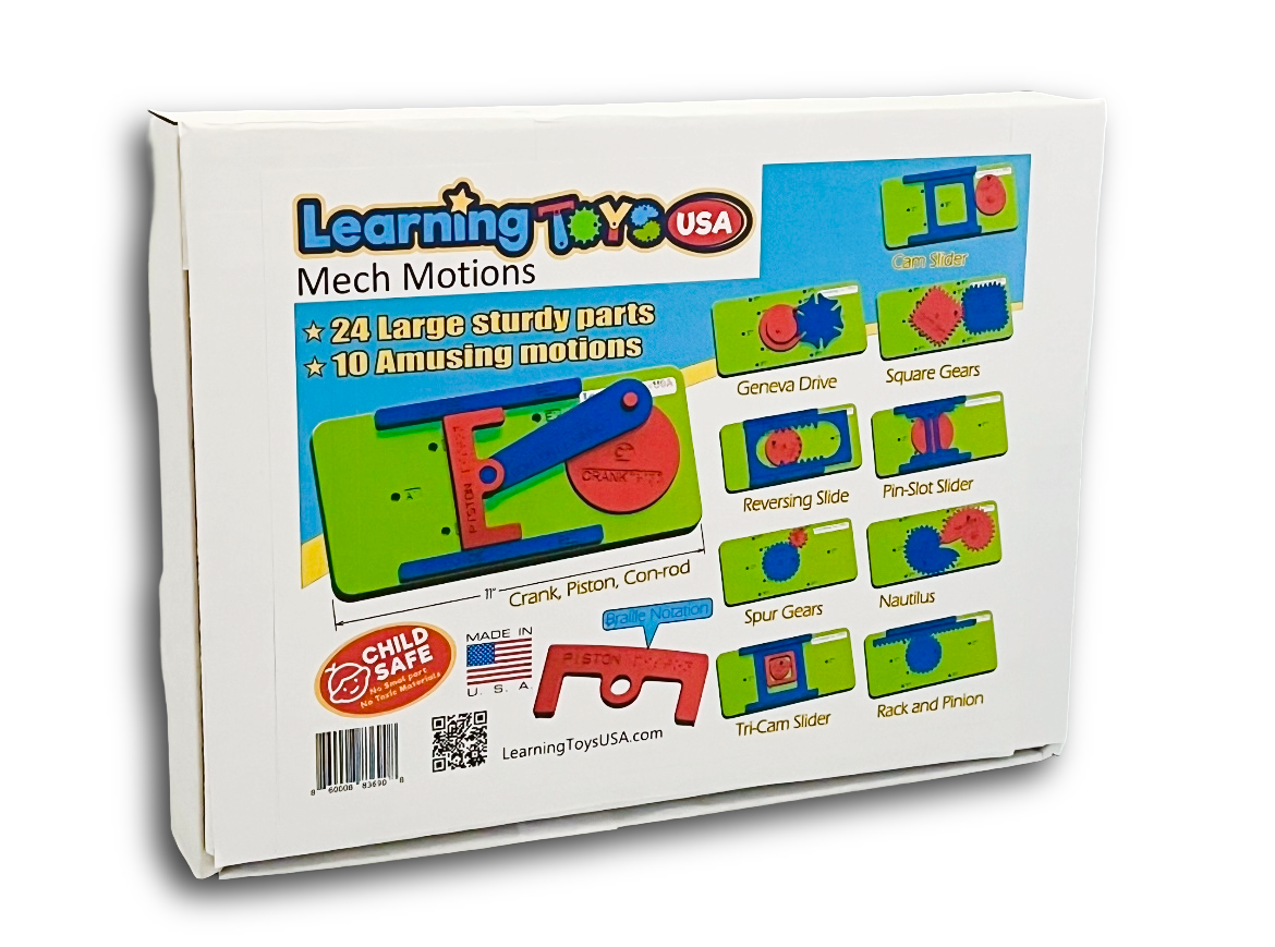 Mech Motions (Short for Mechanical Motions) is a fun, educational toy for kids to learn about different mechanical principles through hands-on assemblies. The 25 piece kit features 10 different assemblies, each involving unique concepts. The kit is composed of large sturdy parts, safe for children of all ages with adult supervision. This Product is Made in USA from start to finish